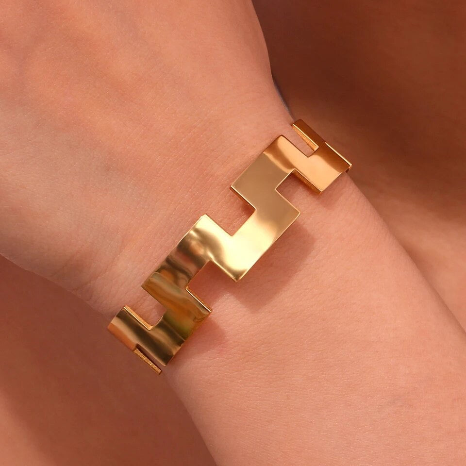 Stunning stainless steel gold plated geometrical bracelet and matching ring set. Crafted with precision and sophistication, this contemporary jewelry ensemble is a perfect blend of style and elegance.